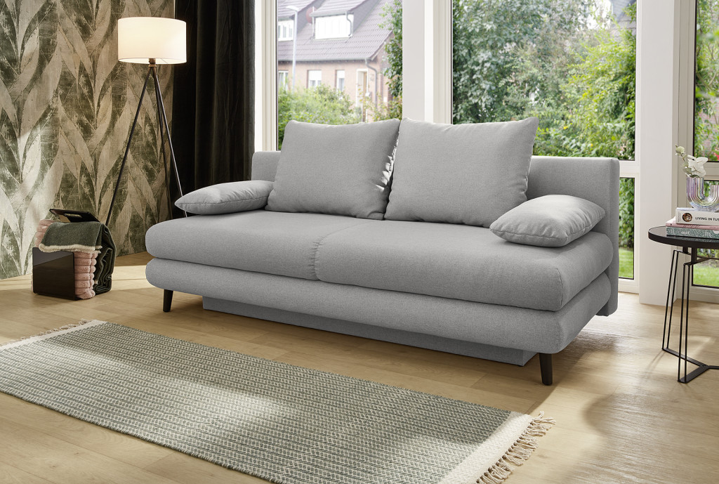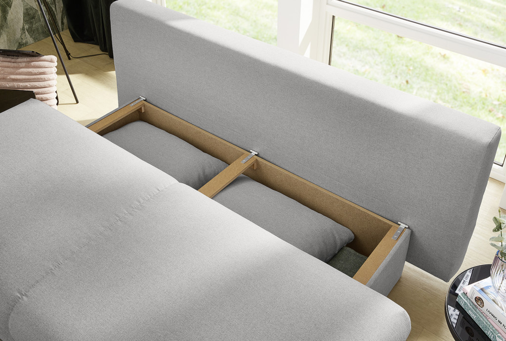Kényelmes, stílusos kanapéágy divatos, modern megjelenéssel. Praktikus vendégágy funkcióval és bőséges tárolóhellyel is rendelkezik, így ideális a váratlan vendégek elszállásolására! A habszivacs bélés kényelmes ülést és alvást biztosít. A teljesen kárpitozott háttámlának köszönhetően a kanapéágy a szoba bármely pontjára elhelyezhető.