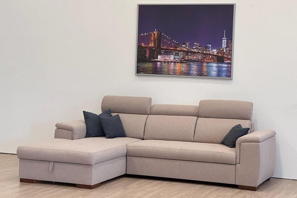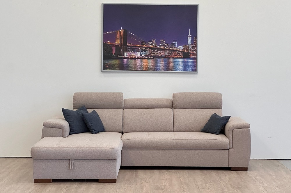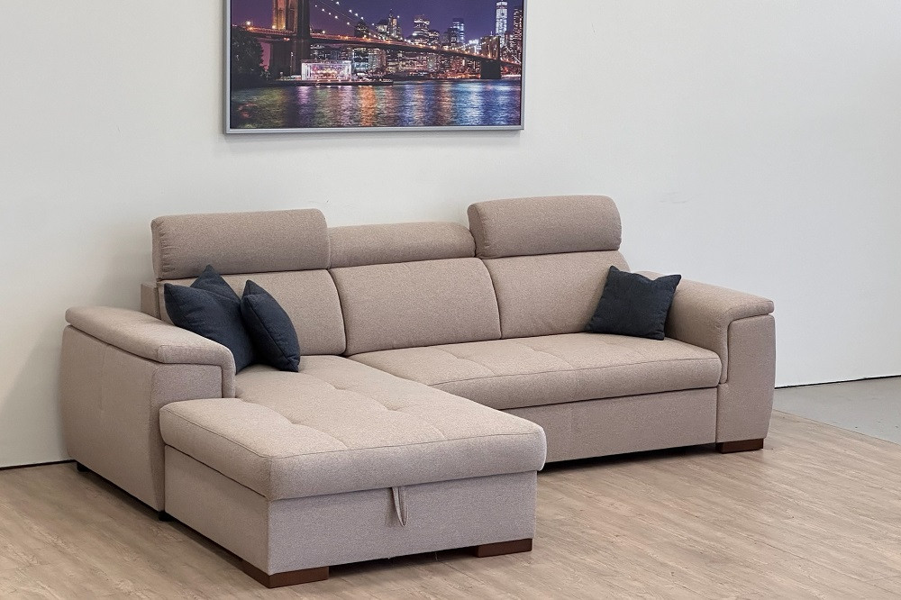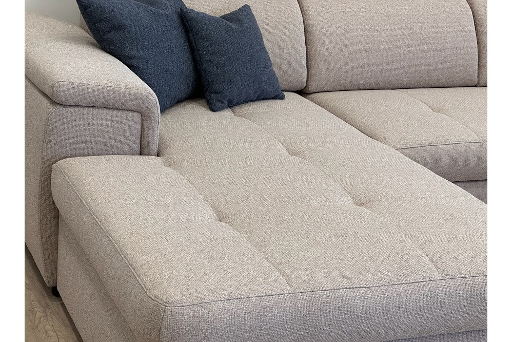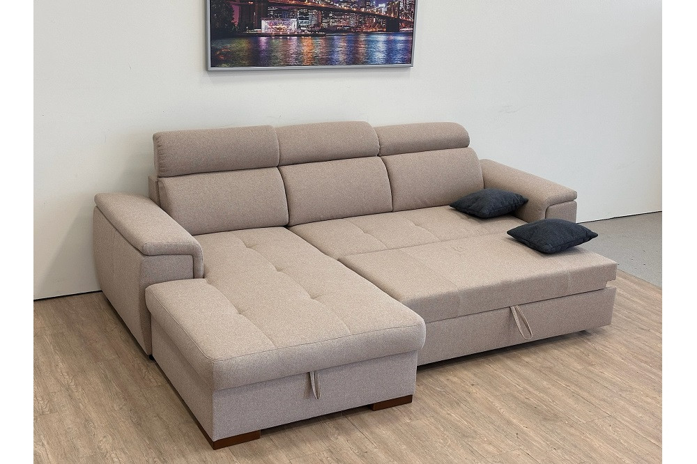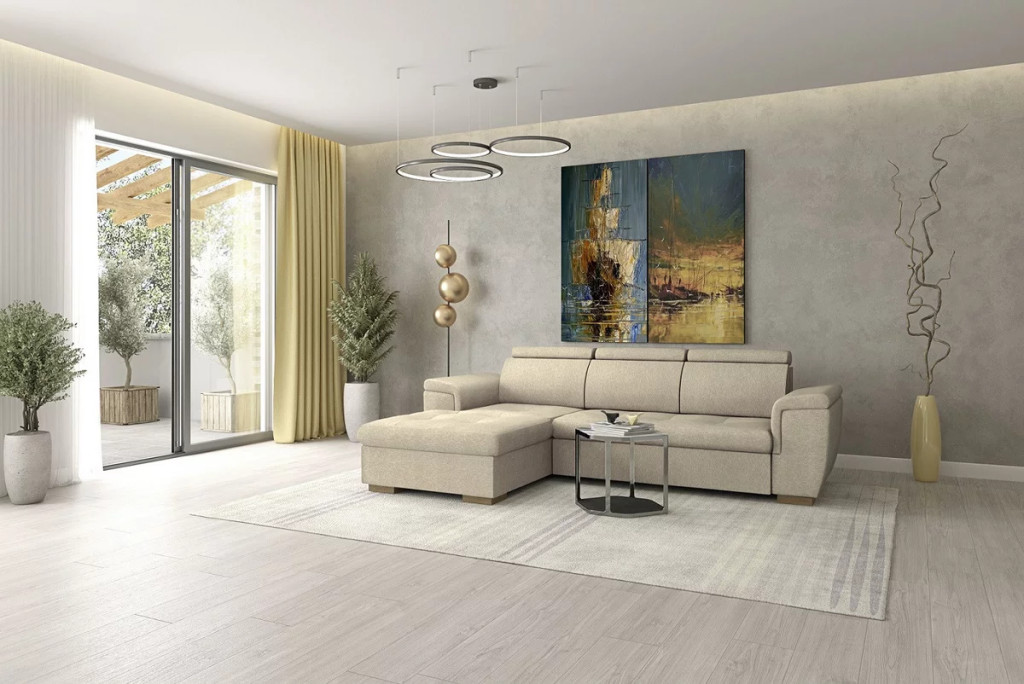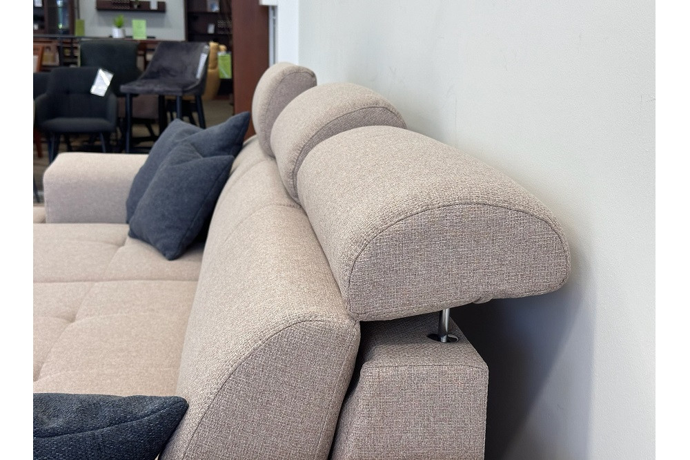 DELANO L-alakú sarok ülőgarnitúra bézs színben, 275x85/103x198 cm-es méretben, ágyneműtartóval és vendégágy funkcióval. Az ülőfelület hullámrugó alátámasztással, 42 cm-es ülés magassággal és 62 cm-es beülési mélységgel rendelkezik. Extra kényelmet a fokozatosan állítható fejtámlák biztosítják. Az ágyneműtartó tágas helyet biztosít párnáknak, ágyneműknek, a vendégágy funkció pedig lehetőséget biztosít, hogy elszállásold a családtagokat, barátokat. Egy könnyed mozdulattal 123x213 cm - es fekvőfelület tárul eléd.