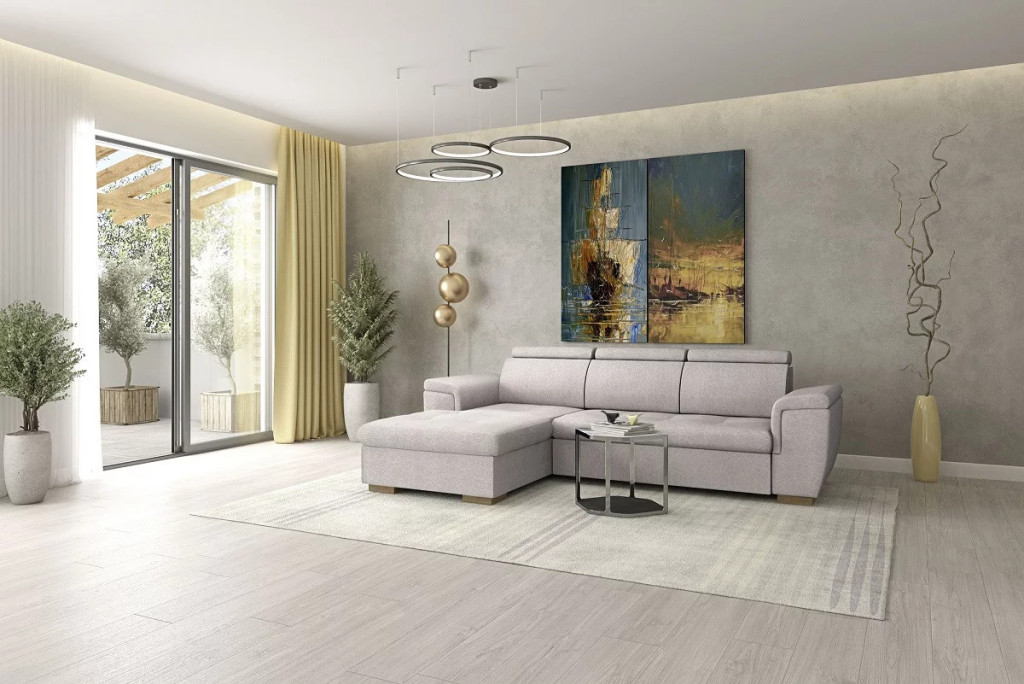 DELANO L-alakú sarok ülőgarnitúra világos szürke színben, 275x85/103x198 cm-es méretben, ágyneműtartóval és vendégágy funkcióval. Az ülőfelület hullámrugó alátámasztással, 42 cm-es ülés magassággal és 62 cm-es beülési mélységgel rendelkezik. Extra kényelmet a fokozatosan állítható fejtámlák biztosítják. Az ágyneműtartó tágas helyet biztosít párnáknak, ágyneműknek, a vendégágy funkció pedig lehetőséget biztosít, hogy elszállásold a családtagokat, barátokat. Egy könnyed mozdulattal 123x213 cm - es fekvőfelület tárul eléd.