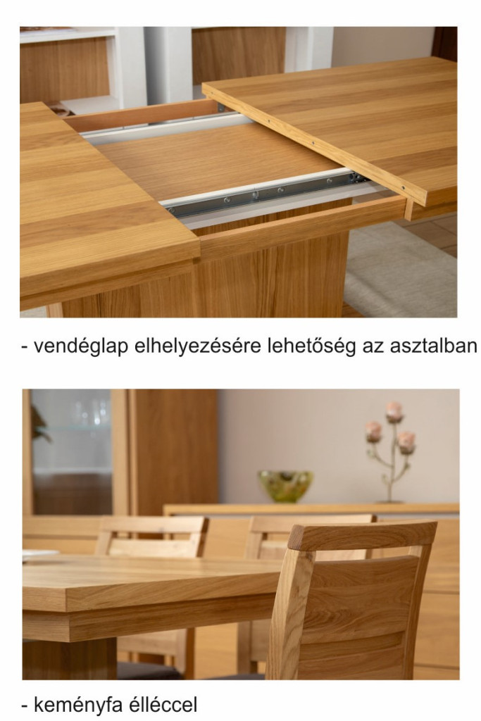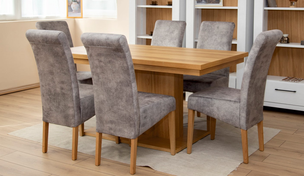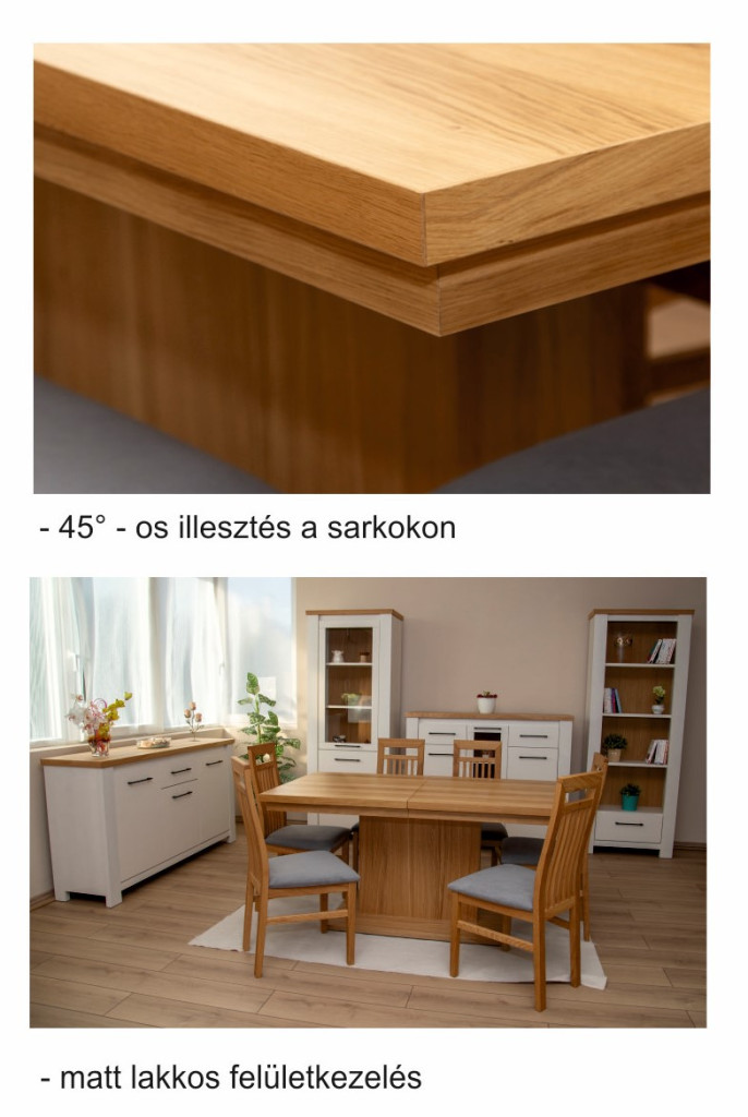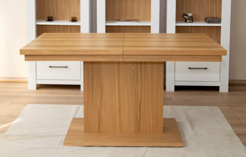 A LYON bővíthető étkezőasztal a funkcionalitást letisztult megjelenéssel ötvözi. Mindennapi étkezésekhez és alkalmi összejövetelekhez tervezve, könnyedén nagyobbítja a felületet a szinkron vasalatnak köszönhetően, hogy több vendég számára is helyet biztosítson. Az asztallap természetes tölgy furnérral van bevonva, így a tömör fa megjelenését nyújtja, miközben tartós marad. Középen elhelyezkedő lába, kényelmes teret biztodsít több fő számára is. Rendelhető több méretben, bővíthető és fix kivitelben, 8 különböző pácszínben.