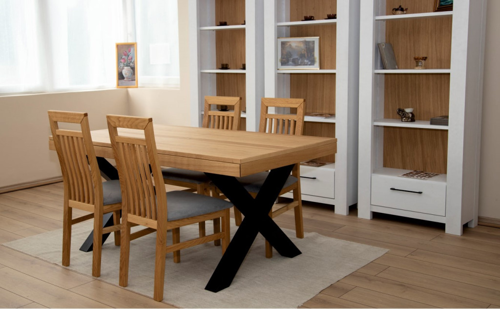 A MELIO bővíthető étkezőasztal a funkcionalitást modern megjelenéssel ötvözi. Mindennapi étkezésekhez és alkalmi összejövetelekhez tervezve, könnyedén nagyobbítja a felületet a szinkron vasalatnak köszönhetően, hogy több vendég számára is helyet biztosítson. Az asztallap természetes tölgy furnérral van bevonva, így a tömör fa megjelenését nyújtja, miközben tartós marad. Masszív, fa X-lábai biztosítják a stabilitást. Rendelhető több méretben, bővíthető és fix kivitelben, 8 különböző pácszínben.