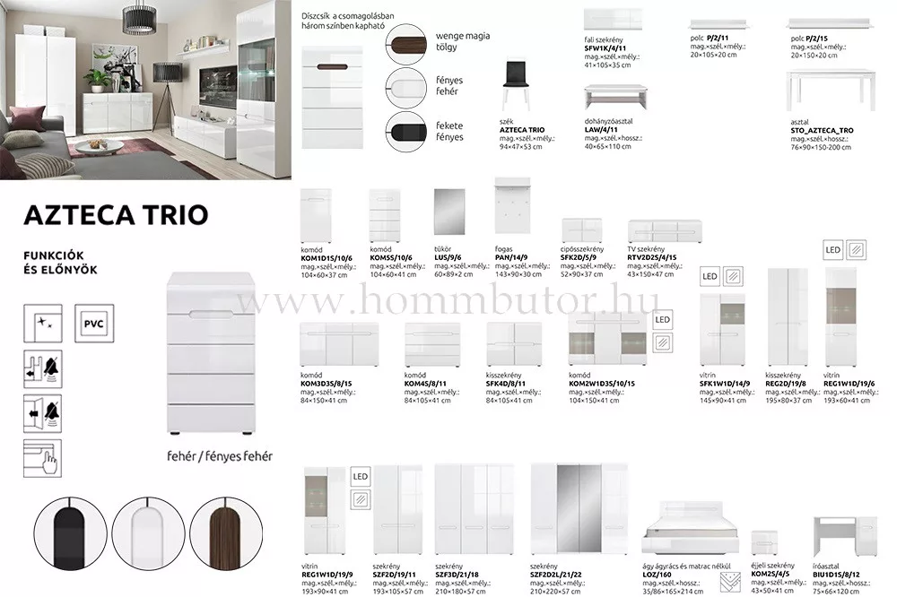 A polclapokat a termék tartalmazza. AZTECA TRIO bútorcsalád elemeiből berendezheted nappalidat, előszobádat, és hálószobádat.Az elemeken látható díszcsík három féle színben kérhető, fényes fehér, fényes fekete, vagy wenge magia tölgy.